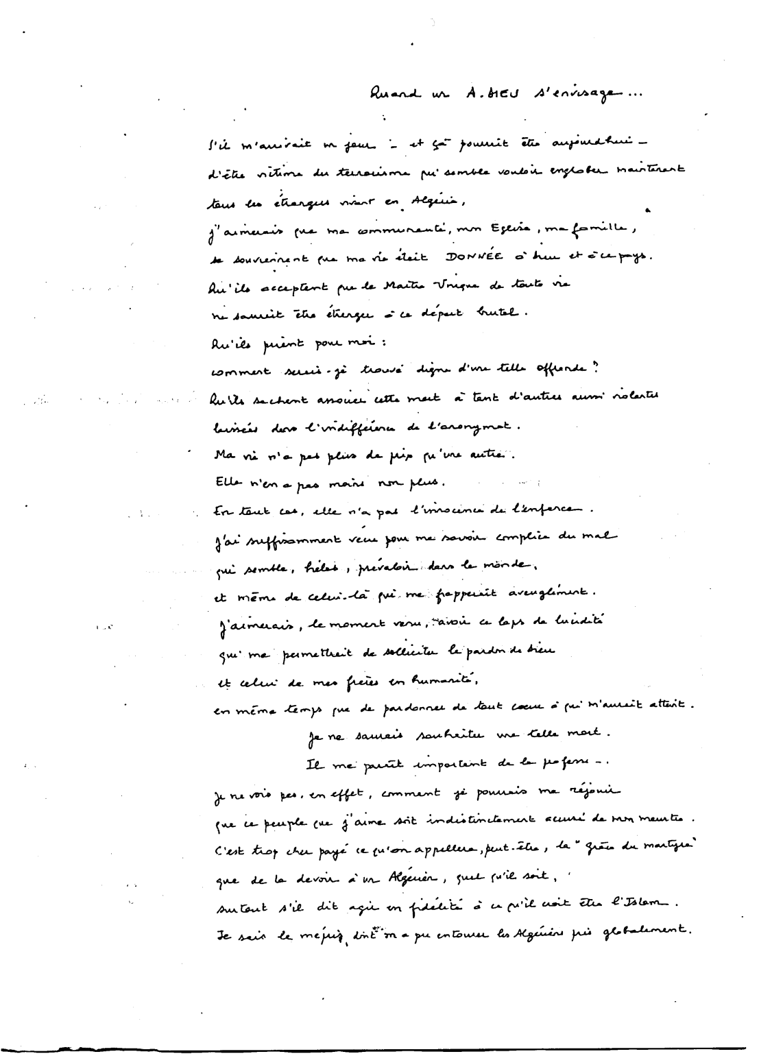 Je ne saurais souhaiter une telle mort. Il me paraît important de le professer. Je ne vois pas, en effet, comment je pourrais me réjouir que ce peuple que j’aime soit indistinctement accusé de mon meurtre. C’est trop cher payer ce qu’on appellera, peut-être, la « grâce du martyre » que de la devoir à un Algérien, quel qu’il soit, surtout s’il dit agir en fidélité à ce qu’il croit être l’Islam.