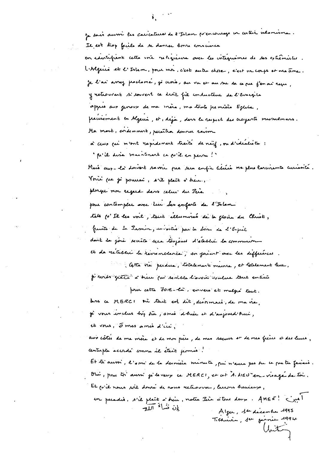 S’il m’arrivait un jour—et ça pourrait être aujourd’hui—d’être victime du terrorisme qui semble vouloir englober maintenant tous les étrangers vivant en Algérie, j’aimerais que ma communauté, mon Église, ma famille, se souviennent que ma vie était DONNÉE à Dieu et à ce pays. Qu’ils acceptent que le Maître Unique de toute vie ne saurait être étranger à ce départ brutal. Qu’ils prient pour moi : comment serais-je trouvé digne d’une telle offrande ? Qu’ils sachent associer cette mort à tant d’autres aussi violentes, laissées dans l’indifférence de l’anonymat.